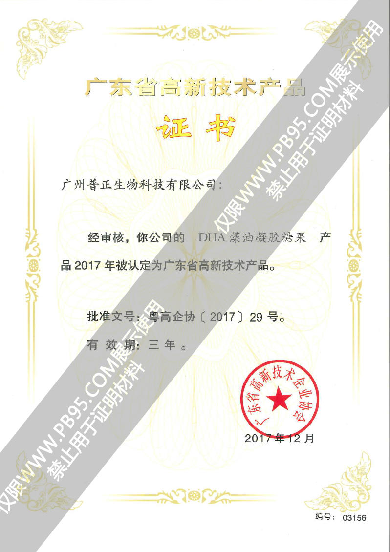 DHA藻油凝膠糖果——17年高新技術產(chǎn)品證書
