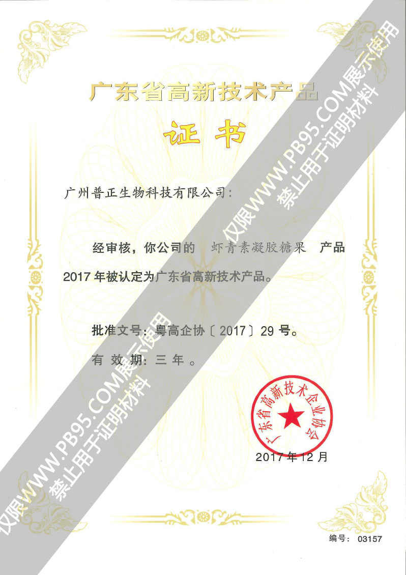 蝦青素凝膠糖果——17年高新技術產(chǎn)品證書