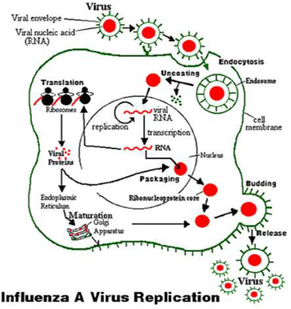 當(dāng)流感病毒入侵人體時(shí),血凝素(HA)經(jīng)由細(xì)胞膜融合進(jìn)入宿主細(xì)胞。神經(jīng)氨酸酶(NA)從感染的細(xì)胞內(nèi)被釋放出來(lái),協(xié)助流感病毒進(jìn)入細(xì)胞復(fù)制并向外擴(kuò)散。