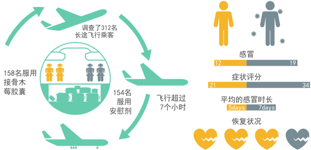60名流感患者,隨機(jī)分成接骨木莓組和安慰劑組,15ml/次接骨木莓糖漿或安慰劑,一天4次,服用5天。接骨木莓組的疼痛,咳嗽,鼻塞充血,呼吸道粘液,睡眠質(zhì)量及總體評(píng)價(jià)明顯更快得到改善。(滿分10為無(wú)病癥狀)