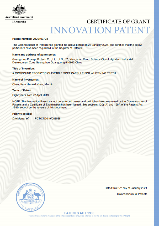 普正生物作為一家長(zhǎng)期致力于研發(fā)的技術(shù)型公司,普正生物自2005年創(chuàng)立以來(lái)收獲了一眾專(zhuān)利與榮譽(yù),最近又喜獲了一項(xiàng)新的國(guó)際發(fā)明專(zhuān)利——口腔益生菌專(zhuān)利證書(shū)--澳大利亞