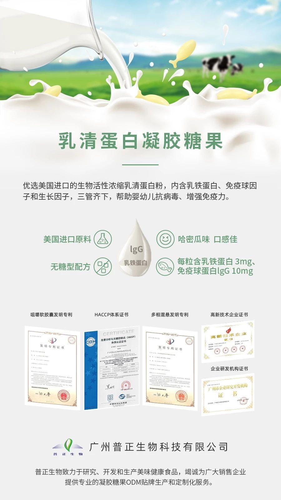 我們研發(fā)的乳清蛋白凝膠糖果,可愛的小魚形狀,蜜瓜牛奶口味,一粒含有3毫克的乳鐵蛋白和約10毫克的免疫球蛋白IgG,運用普正自有的iChew技術進行深加工,令其咀嚼起來口感更細膩軟糯,內容物粒徑達到數(shù)十微米級別更利吸收,天然貼合寶寶的營養(yǎng)需求,讓寶寶喜歡吃,放心吃,健康吃!